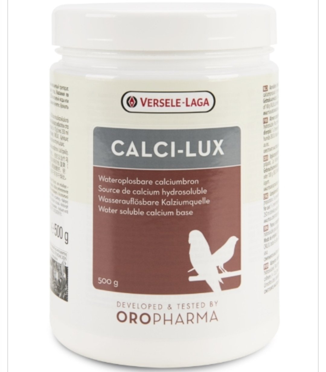 Versele Laga Calci-lux Soluble Calcium is a high quality, water soluble source of calcium. This dietary supplement is administrated for good egg shell formation, for good skeletal development in young birds, during the breeding season to prevent egg-binding and in cases of calcium deficiency or calcium tetany. Calcium is involved in brain and nerve function and can improve behavioural problems such as feather plucking or chewing