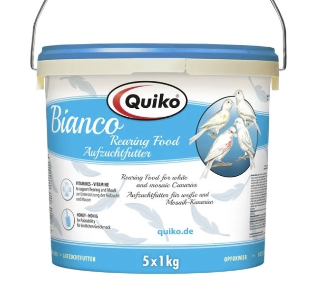 Quiko Bianco is a high-quality concentrate and rearing food for white, light-colored canaries and mosaics. Also suitable for woodland birds and exotic birds. Quiko Bianco contains nutrients that young and adult birds need during breeding and moulting. It contains no egg and no color additives and thus prevents unwanted color deposits, especially in mosaic canaries. Quiko Bianco contains honey and vitamins. In particular, the vitamin A it contains supports white-ground, recessive bird species that cannot process provitamin A naturally or only to a limited extent. It can be given all year round as a condition feed. When rearing woodland birds, it is advisable to supplement the rearing feed with animal protein (e.g. pinkies, buffalo worms or mealworms).